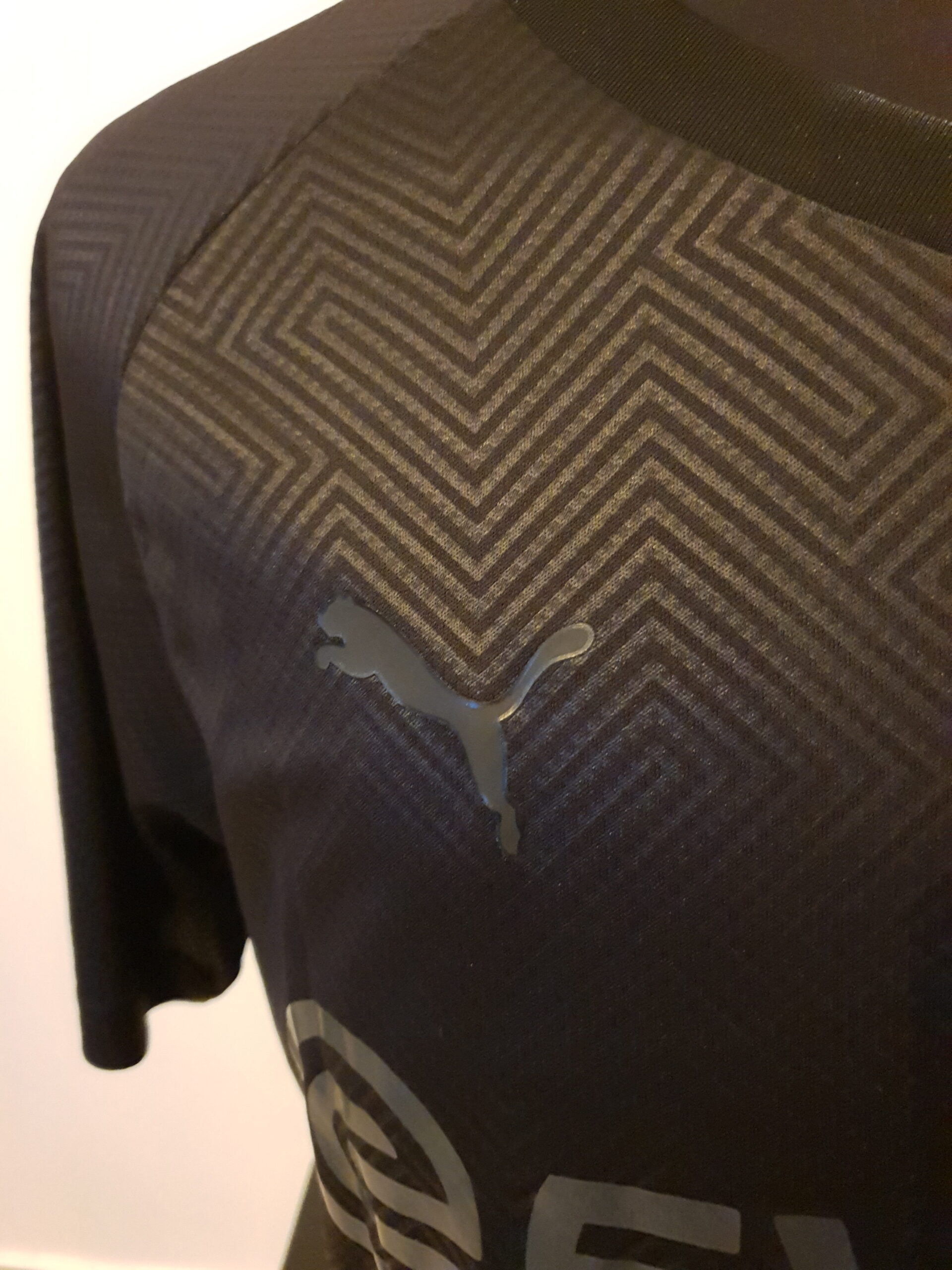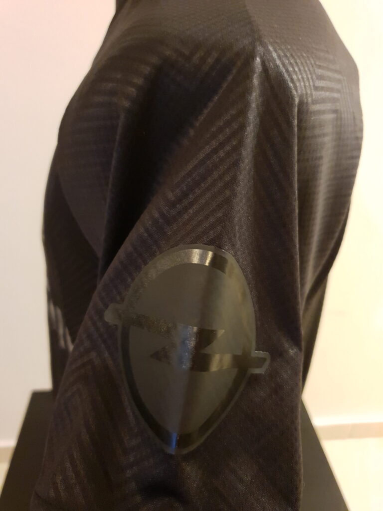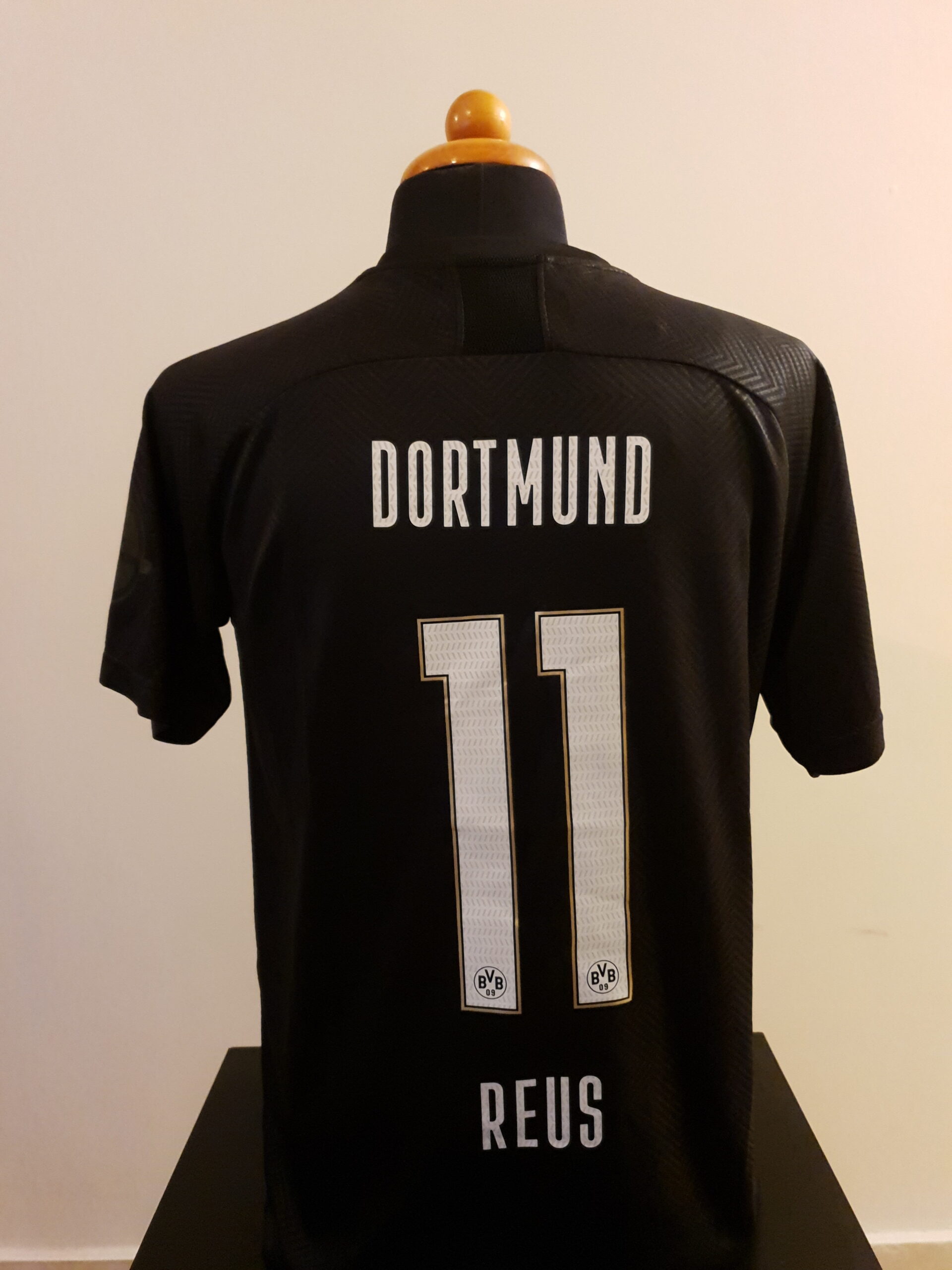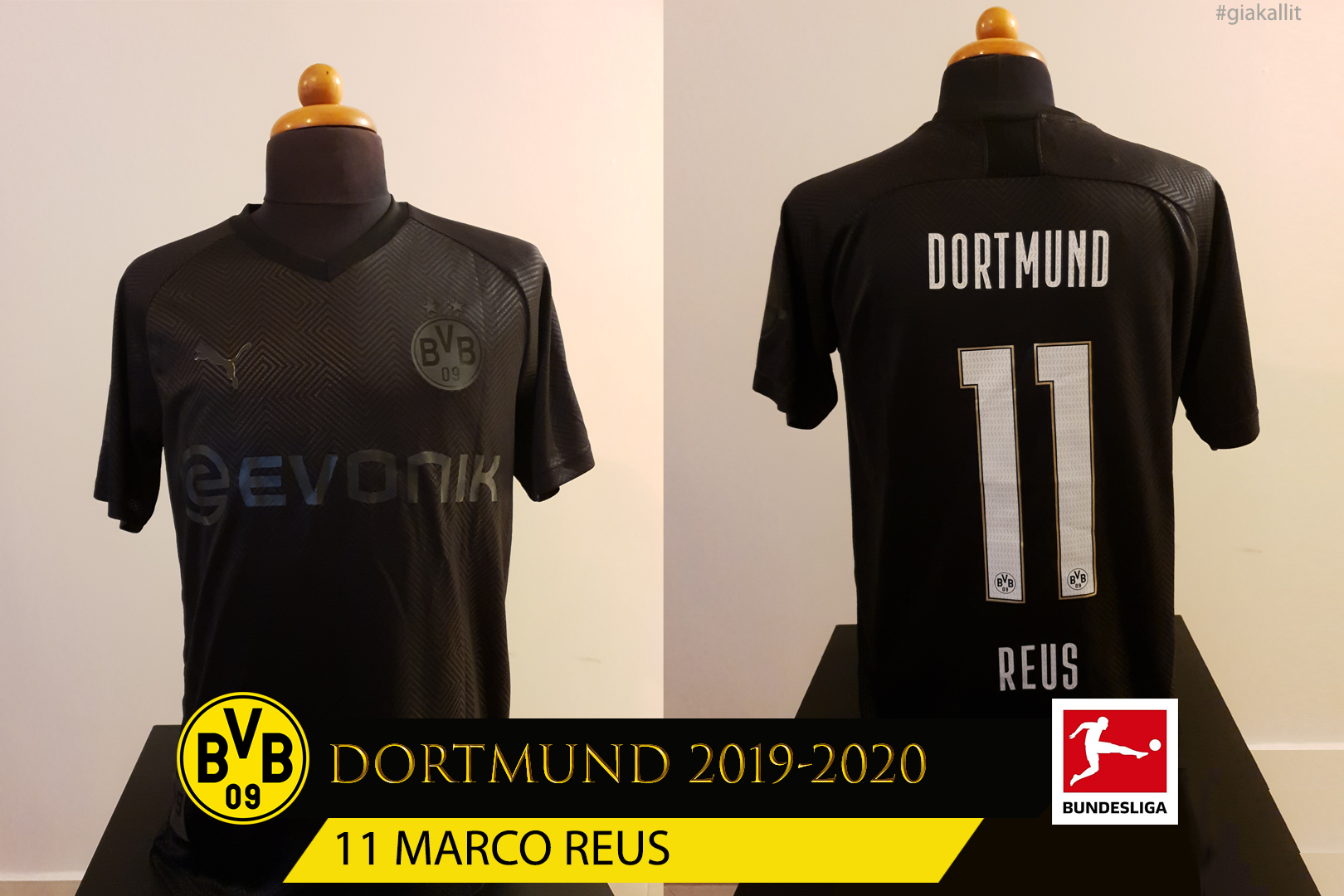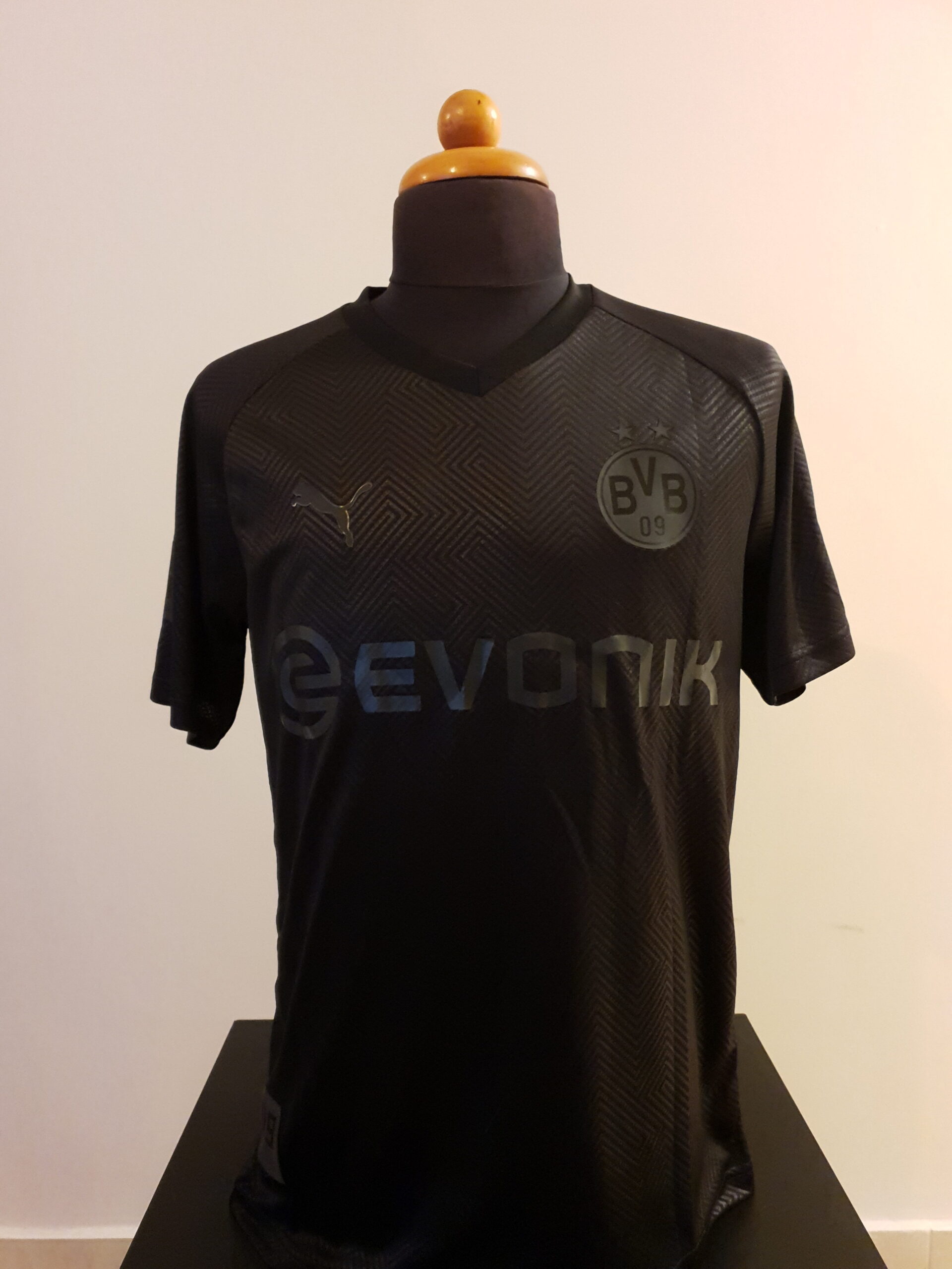 In 2019, Borussia Dortmund turned 110 years old. The team celebrated this birthday with a spectacular anniversary black jersey. The badge, the puma logo, the chest and sleeve sponsors and the Bundesliga badge on the other sleeve were black so that the look would have no color other than black. It worn on December 9th ,the day of the team's birthday, against Fortuna Düsseldorf. Dortmund won easily 5-0. The anniversary jersey was released in 1909 numbered copies in honor of the year the group was founded and sold out in just 105 minutes. At the bottom is the copy number.