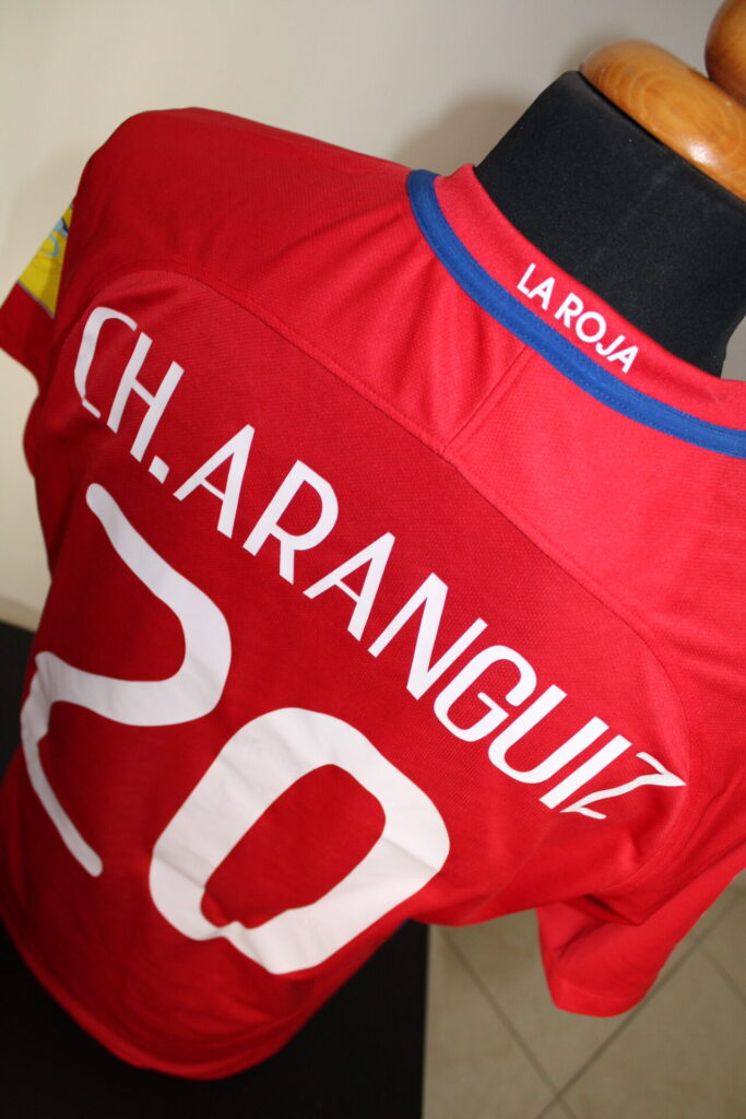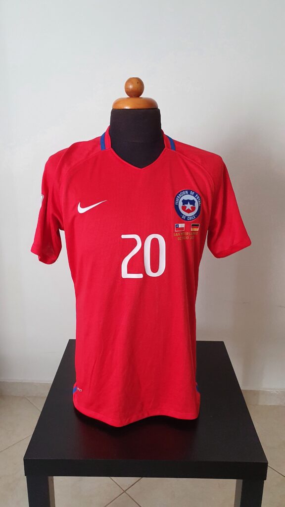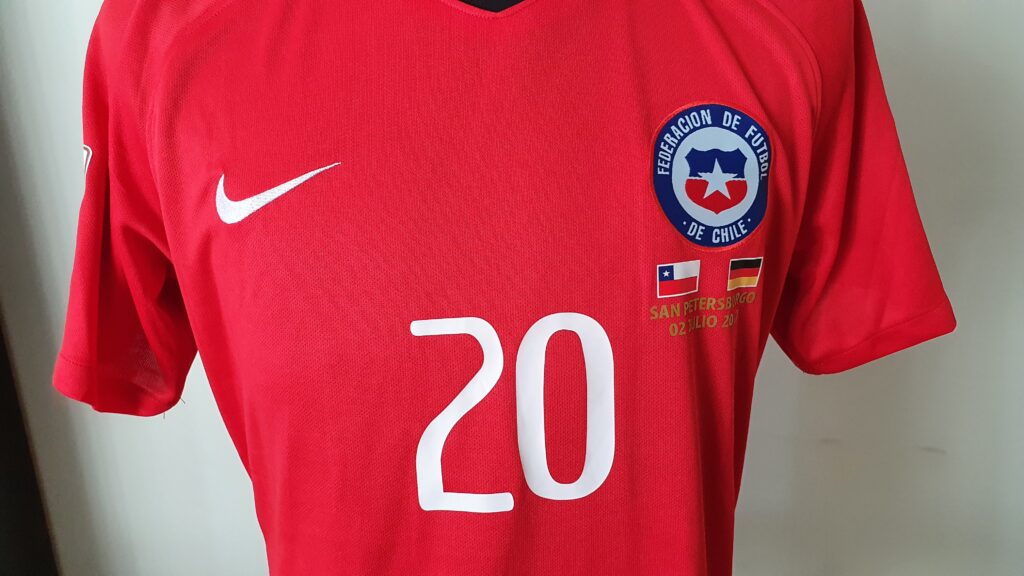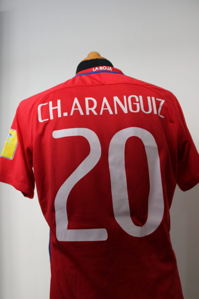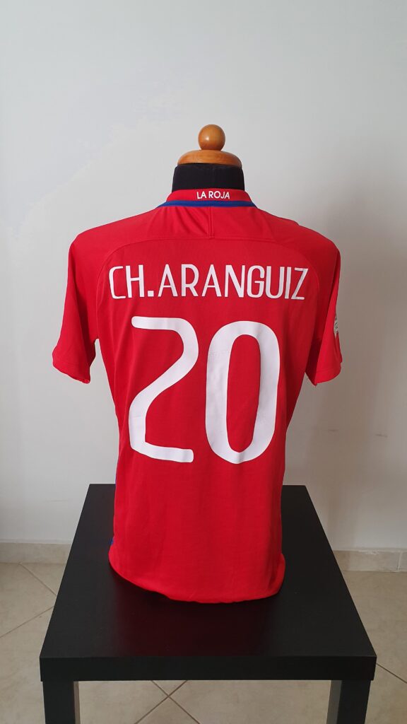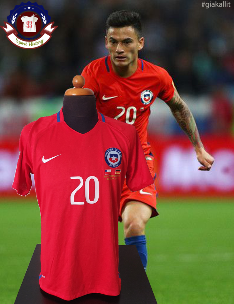 Chile wore a very beautiful and simple jersey made by Nike. The same jersey was worn last year when Chile participated in the anniversary Copa America in the USA for the celebration 100 years of the event. On the sleeves are the patches of the tournament and on the chest, under the coat of arms, are written the details of the match (date, city and opposing teams). Charles Aránguiz was a key member of the team in that tournament and played in the final until the 81’ minute when he was replaced by Edson Puch.