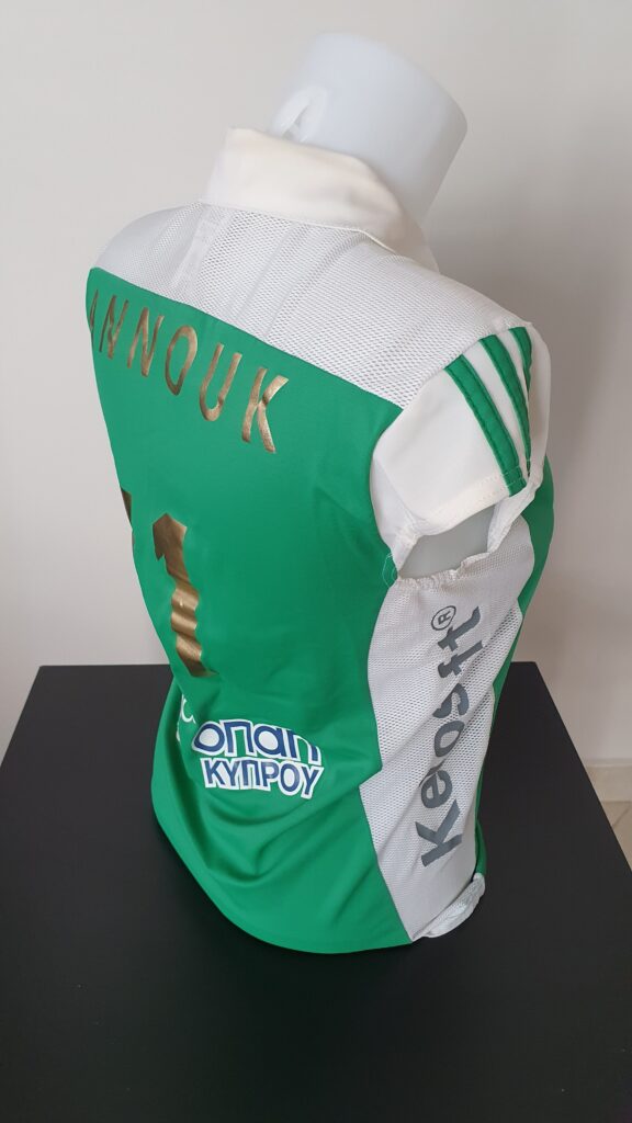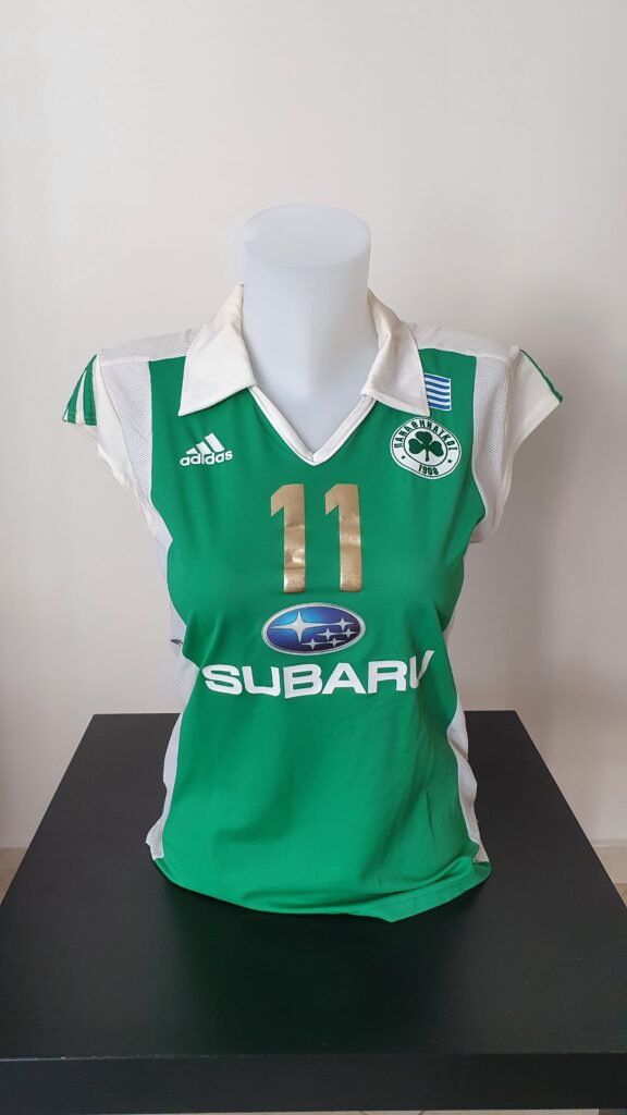 This jersey was worn during the season during which Panathinaikos celebrated its 100th anniversary. For this reason the names of the athletes and the numbers were golden. In addition, the athletes used nicknames or their first names on his jerseys and did not use adjectives as usual. Anna Karpouza used this shirt during the season.