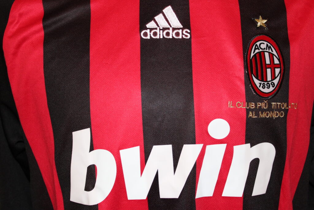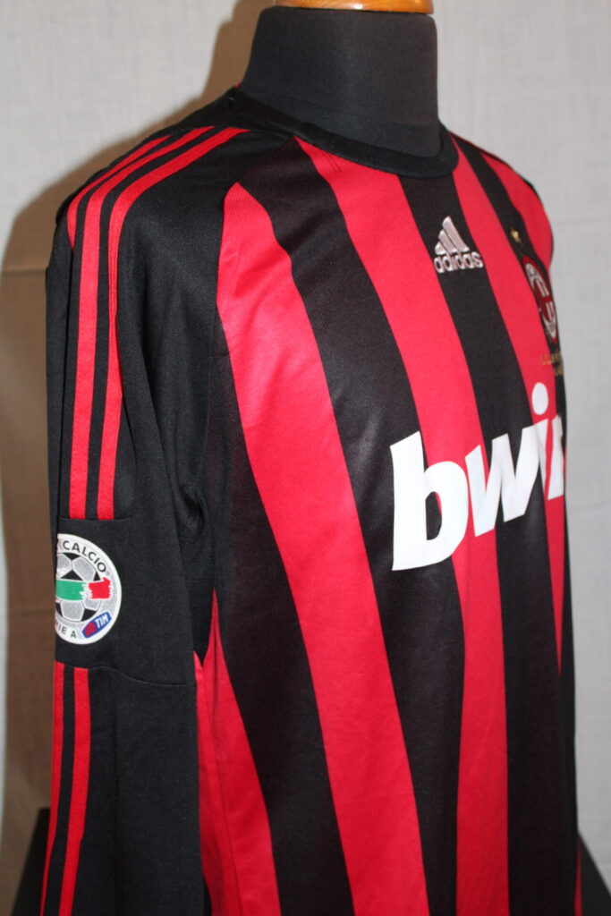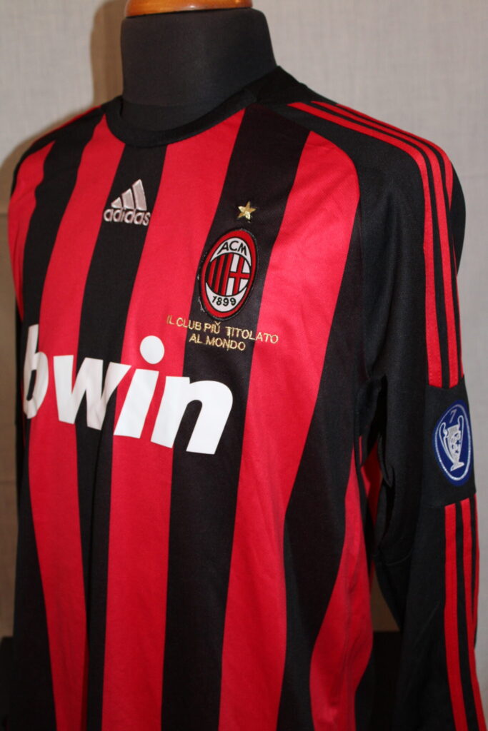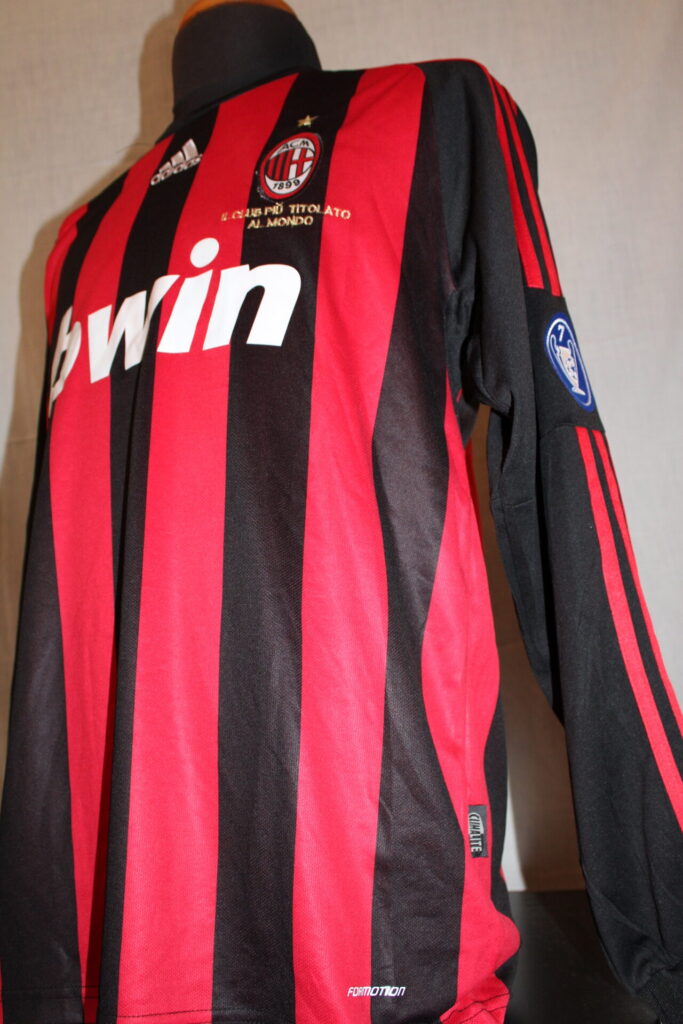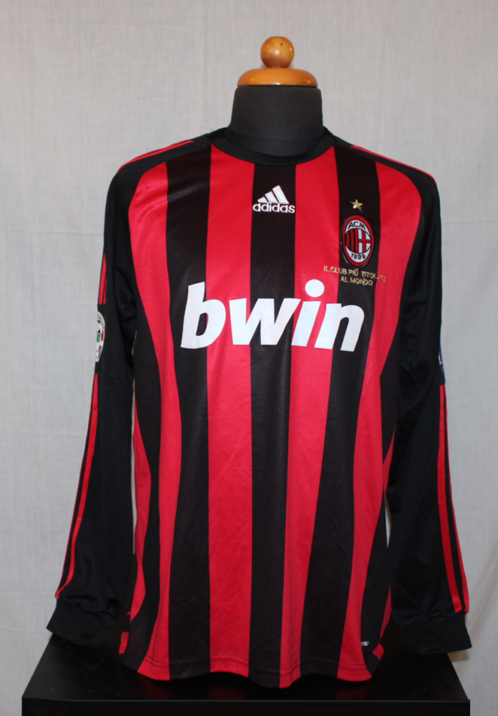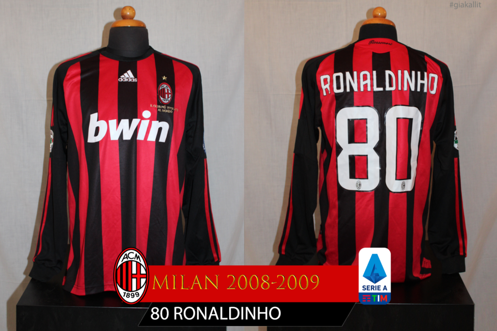 Ronaldinho scored 10 goals in 32 appearances in the 2008-2009 season. However, the Brazilian most of the time came from the bench as his physical condition was not ideal. In most of his games he used to wear the long-sleeved Milan jersey. Milan had won the Club World Cup in December 2007 and so until December 2008 it had the patch of world champions on its shirt, on the right side of its chest. Also under the badge was written in gold letters "il club piu titolato al mondo" which means "the most successful team in titles in the world". This was based on the recognition by FIFA that Milan was the team with the most international titles in the world as until then it counted 7 Champions League or Champions Cups, 2 Cup Winners' Cups, 5 European Super Cups but also 3 Intercontinental and 1 Club World Cup.