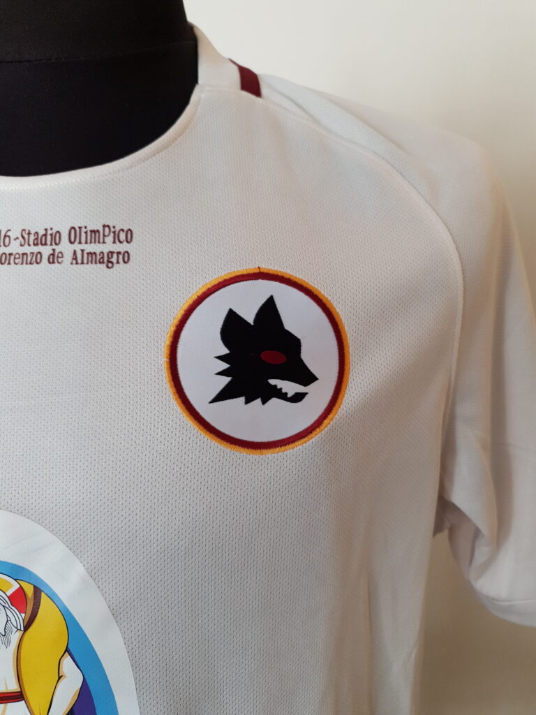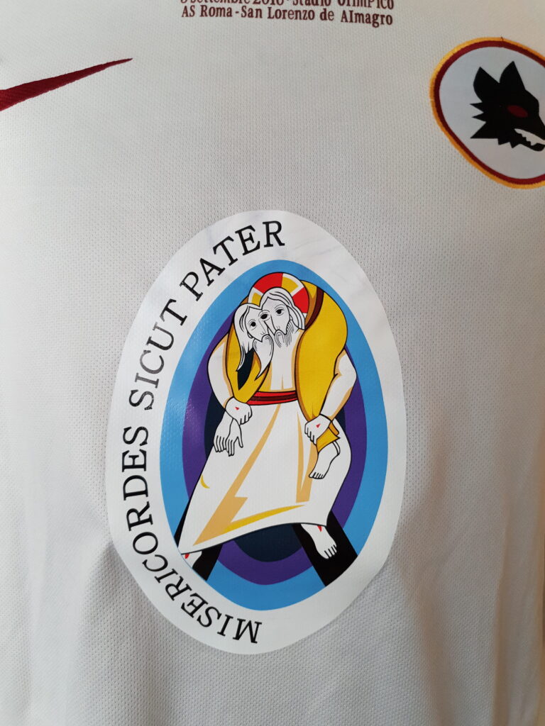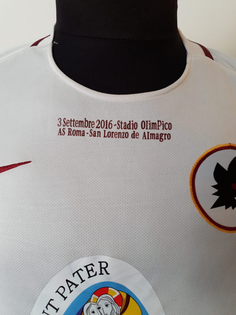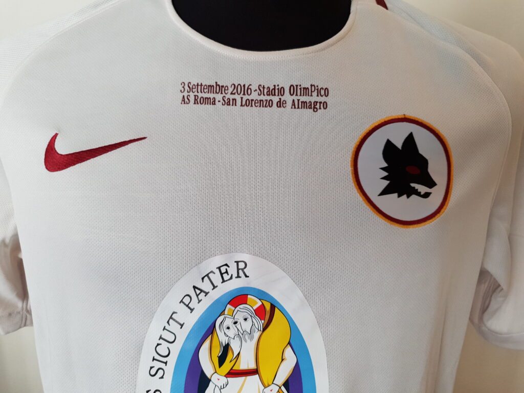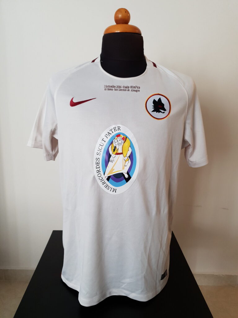 The match ended with a score of 2-1 in favor of Roma with goals from Iturbe and Keba Coly while Fernando Bellucci had tied at 1-1. In this match, however, this special jersey was worn by the hosts. The design is based on the away jersey of Roma where there was no usual Roma emblem but one of its previous versions. In addition, there is an obvious difference from the jersey of that match. In addition to the match details that were printed, the logo of "Misericordes sicut Pater" (Mercy as Father) was also printed on the chest as the match was organized as part of the charity event "Family Celebration", as one of the activities of the Holy Year , sponsored by the Pontifical Council for the Promotion of the New Evangelism.