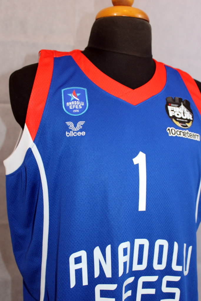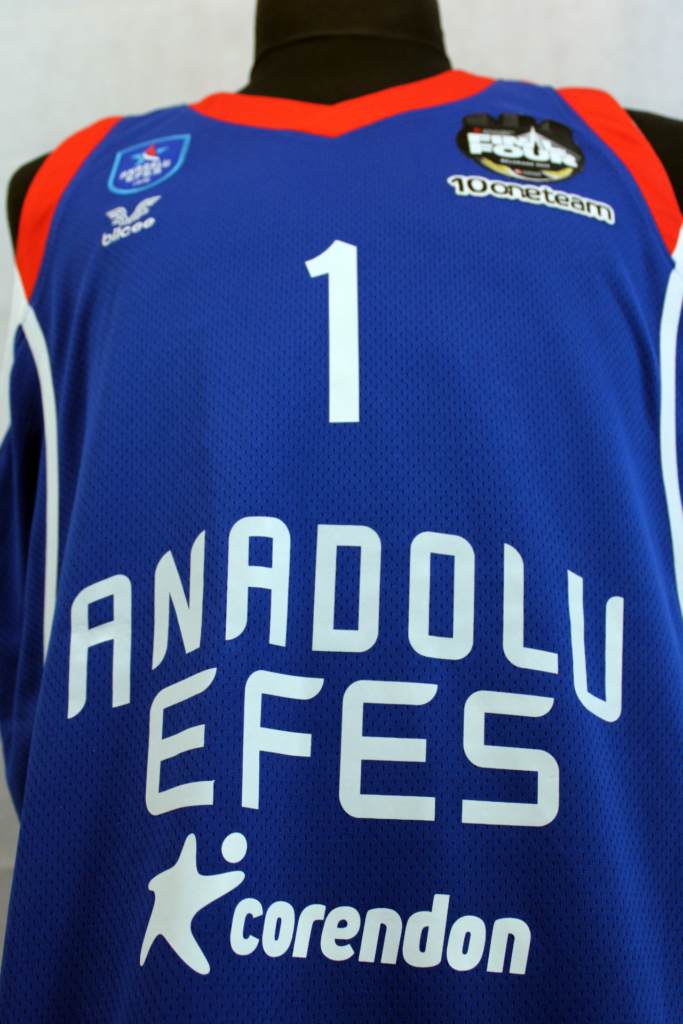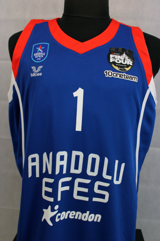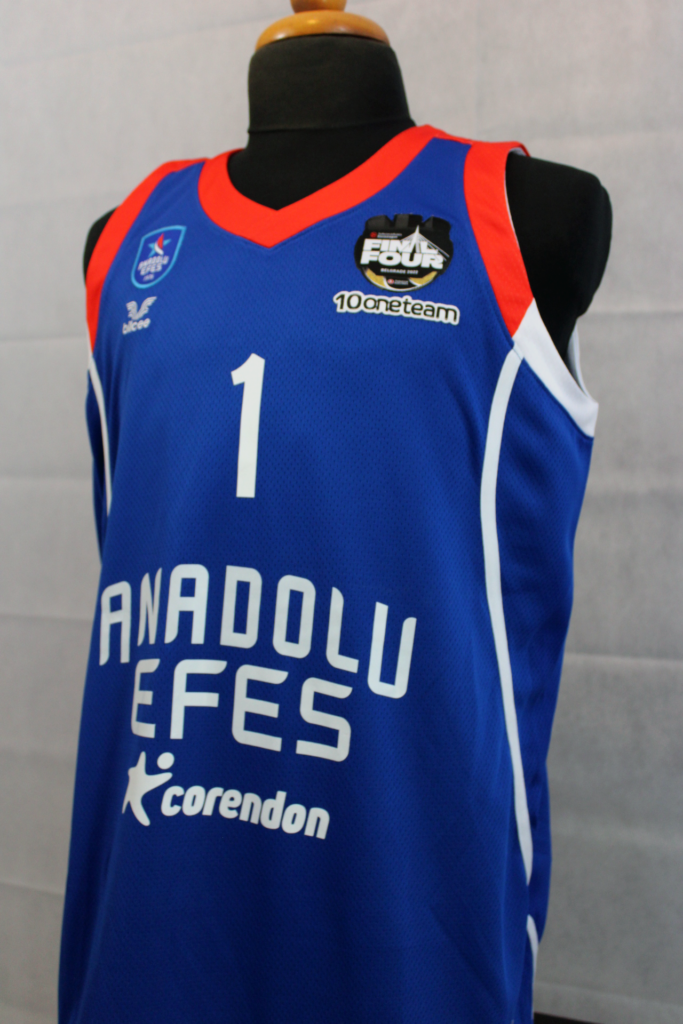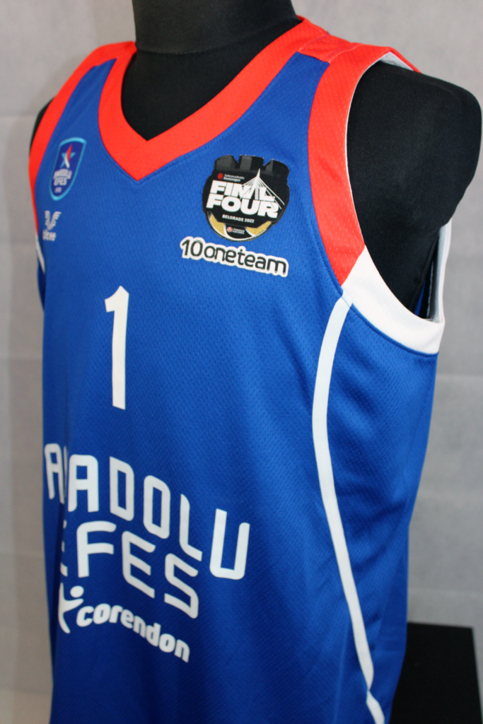 Rodrigue Beaubois has been one of the team's most important players throughout the season. In the Euroleague that season he had 35 appearances with 9.2 points per game and 1.9 assists. This jersey is one of the ones he had in the locker room at the 2022 Final 4. The patch used only in the Final 4 featured gold details as Efes was the previous year's trophy holder. In addition, underneath there is the oneteam logo which completed 10 years of life. Efes wore the same kit as the previous season however in the 2022 final, unlike in 2021, they wore the blue kits.